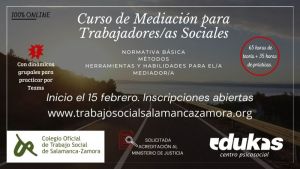 Como ya sabéis, el Colegio está tramitando su inscripción en el Registro del Ministerio de Justicia como Institución de Mediación y Entidad de Formación en Mediación. Para ello ya estamos elaborando una bolsa de Mediadores/as que permanecerá abierta permanentemente para solicitar la inclusión en ella, se elaborará un listado y será enviado anualmente al Decanato de Justicia de Salamanca y Zamora para su inclusión en sus bases de datos.