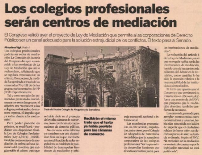 NOTICIA PUBLICADA EN EL DIARIO EXPANSION SOBRE EL PROYECTO DE LEY DE MEDIACIÓN APROBADO EL 31 DE MAYO EN EL CONGRESO EN EL QUE SE RECONOCE A LOS COLEGIOS PROFESIONALES CENTROS DE MEDIACIÓN
