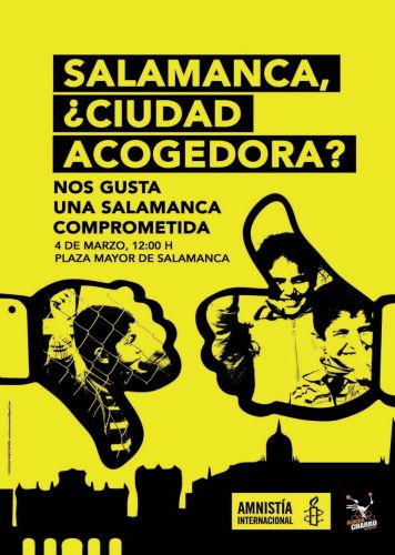 "SALAMANCA, CIUDAD ACOGEDORA" Amnistía Internacional llevará a cabo una acto el 4 de marzo, en numerosas ciudades de nuestro país, un acto de solidaridad con las miles de personas que, a las puertas de la Unión Europea, esperan refugio y ser acogidas.