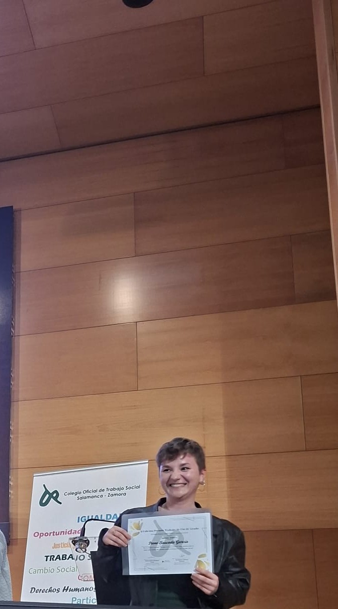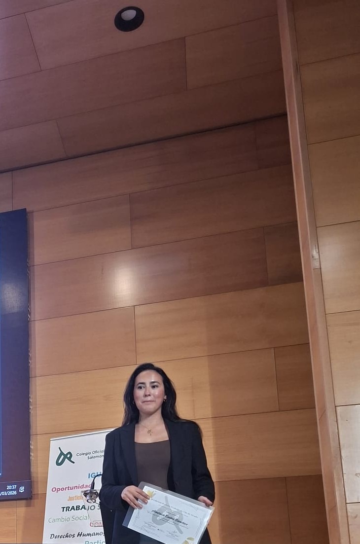 En el desarrollo de la jornada entregamos el Premio al Mejor Trabajo de Fin de Grado en Trabajo Social del curso académico 2024/25 a Carla de la Iglesia Coca por su trabajo titulado “BREAKING BULLYING: Proyecto de Innovación Social para Prevenir, Detectar y Concienciar en Materia de Acoso Escolar o Bullying”, contando a su vez con la participación de la premiada, quién trasladó a los asistentes unas breves palabras sobre su trabajo.