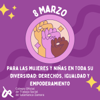 El Colegio Oficial de Trabajo Social de Salamanca-Zamora, junto con el Consejo General del Trabajo Social un año más se suma a las reivindicaciones del 8 de Marzo, Día Internacional de la Mujer, y pone el foco en las mujeres jóvenes y niñas como motores de cambio y avance para seguir construyendo sociedades igualitarias.