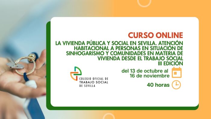 CURSO ONLINE: LA VIVIENDA PÚBLICA Y SOCIAL EN SEVILLA. ATENCIÓN HABITACIONAL A PERSONAS EN SITUACIÓN DE SINHOGARISMO Y A FAMILIAS Y COMUNIDADES EN MATERIA DE VIVIENDA DESDE EL TRABAJO SOCIAL. III EDICIÓN