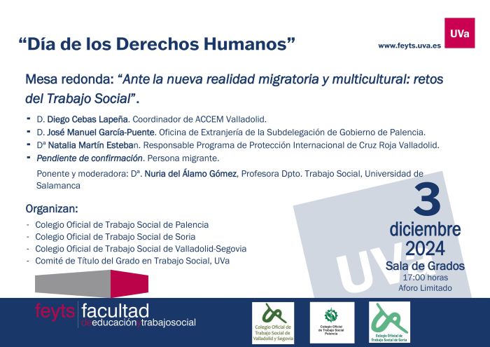 Los Colegios Oficiales de Trabajo Social de Valladolid-Segovia, Palencia, Soria y el Comité de Título de Trabajo Social celebrarán el Día de los Derechos Humanos, fiesta de la Facultad de Educación y Trabajo Social, el martes 3 de diciembre con una mesa redonda titulada ‘Ante la nueva realidad migratoria y multicultural: retos del Trabajo Social’.
